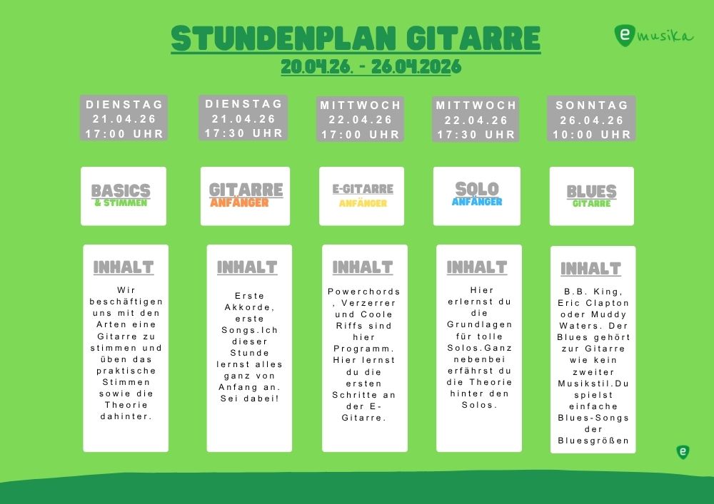 Neben den bestehenden Gitarren-Online Kursen für Kinder, Erwachsene und E-Gitarre, kannst du ab dem 20.04.2026 an mehrmals wöchentlich stattfindenen Live-Unterrichtsstunden teilnehmen. Egal ob Du einmal, zweimal oder mehrmals in der Woche dabei sein möchtest - alles ist im monatlichen Abo enthalten.